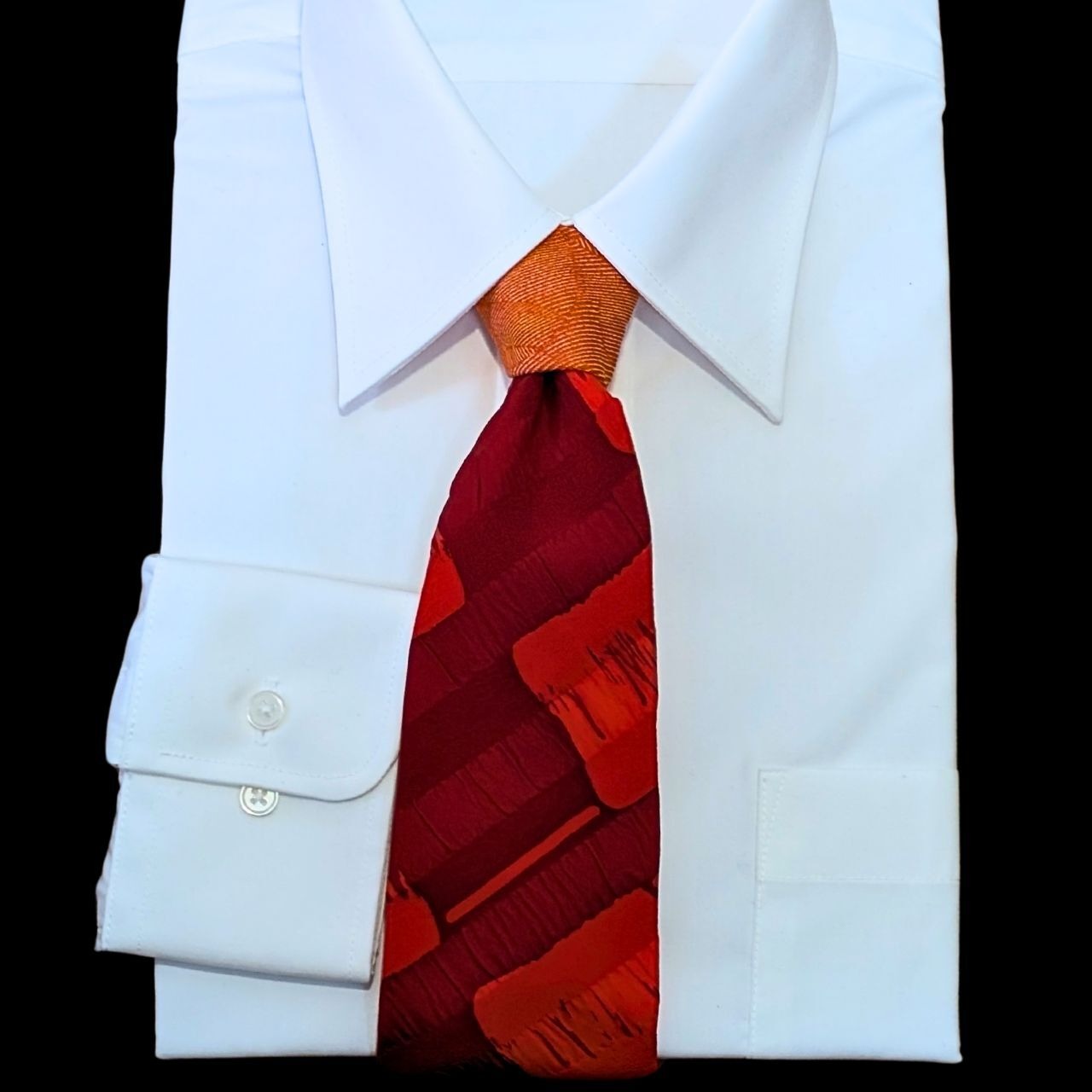 ・結び目に配された橙のクレリック切り替えが、装いに遊び心を添える