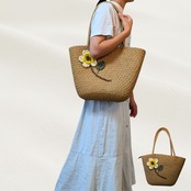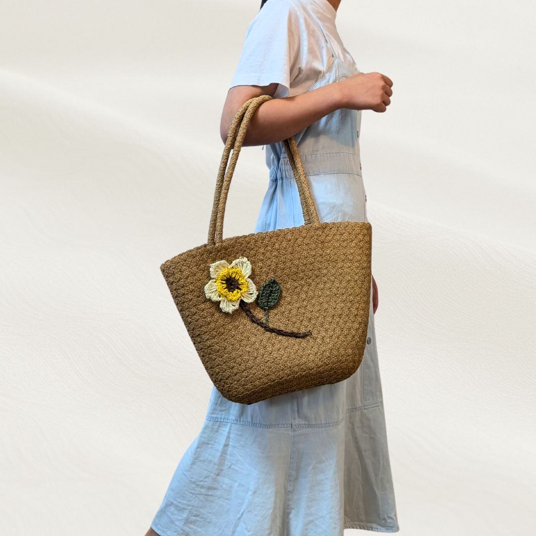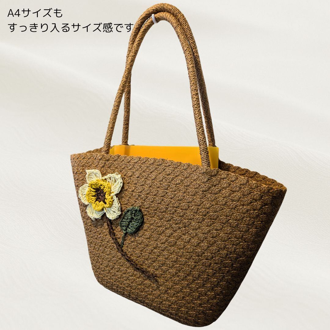 ナチュラルブラウンの本体に、立体的な一輪の花刺繍が印象的なかごバッグ。
