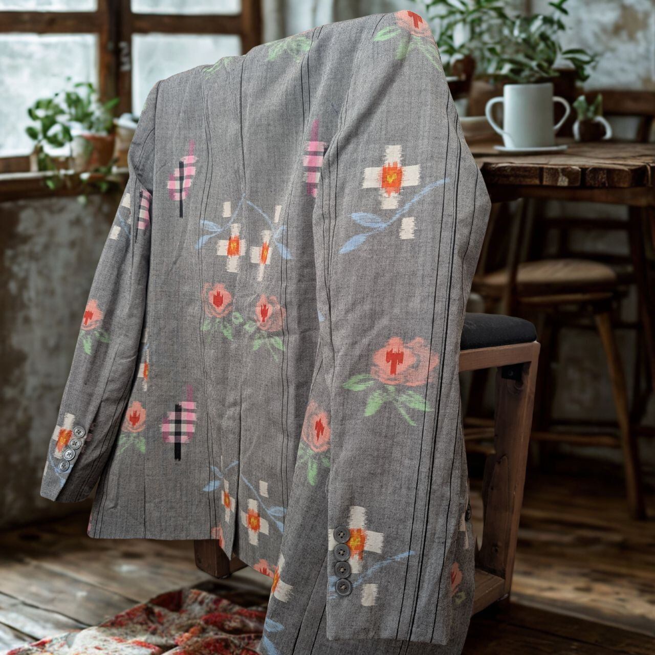 グレーベースの落ち着いたトーンに、 絣(かすり)のような幾何学模様と、柔らかな花柄が浮かび上がります。